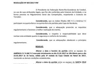 O presidente da Federação norte-rio-grandense de Futebol, José Vanildo, comunicou por meio de resolução na tarde desta quinta-feira (19), a alteração da data e hora do clássico entre América e ABC. A partida que estava marcada para o próximo sábado (21) às 19h30 na Arena das Dunas, foi adiada para o domingo (22) às 16h, mantendo-se o local.