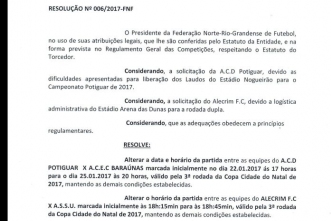O presidente da Federação Norte-rio-grandense de Futebol (FNF), José Vanildo, anunciou por meio de resolução nesta segunda-feira (17) alterações em duas partidas válidas pela terceira rodada do Campeonato Potiguar 2017, atendendo a pedidos dos filiados.