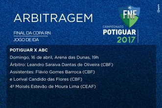 A arbitragem para a primeira partida da final da Copa RN foi definida nesta quinta-feira (12), por meio de audiência pública. O anúncio foi transmitido ao vivo na fanpage da Federação Norte-rio-grandense de Futebol (FNF). A partida acontece entre Potiguar e ABC dia 16 de abril, na Arena das Dunas, às 19h.