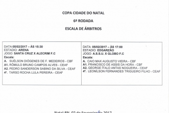 Foi divulgada por meio de Audiência Pública realizada na tarde desta quinta-feira, a arbitragem para os dois primeiros jogos da 6ª rodada, que serão realizados no próximo dia 5. Os jogos são Santa Cruz x Alecrim na Arena das Dunas e ASSU x Globo no Edgarzão.