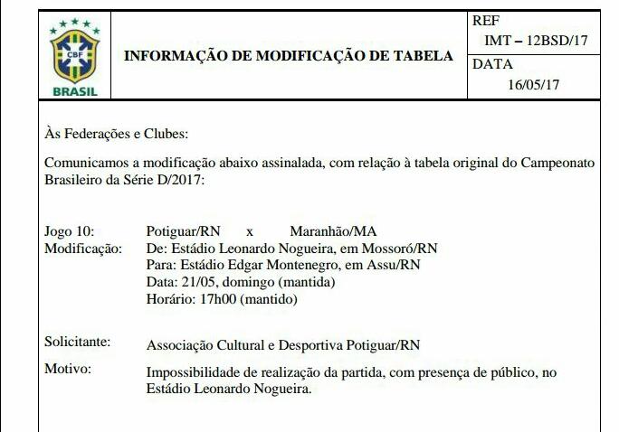 Atendendo a solicitação do Potiguar, a Confederação Brasileira de Futebol (CBF) modificou o local da partida entre Potiguar e Maranhão. O jogo estava marcado para o estádio Nogueirão em Mossoró e será realizado no estádio Edgarzão, em Assu.