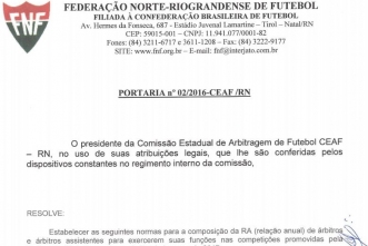 O Presidente da Comissão Estadual de Arbitragem de Futebol (CEAF), Coronel Ricardo Albuquerque, no uso de suas atribuições legais, informa aos árbitros e assistentes que estão abertas as inscrições para compor o quadro de árbitros da temporada 2017 do futebol potiguar.