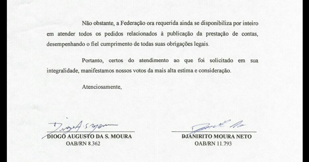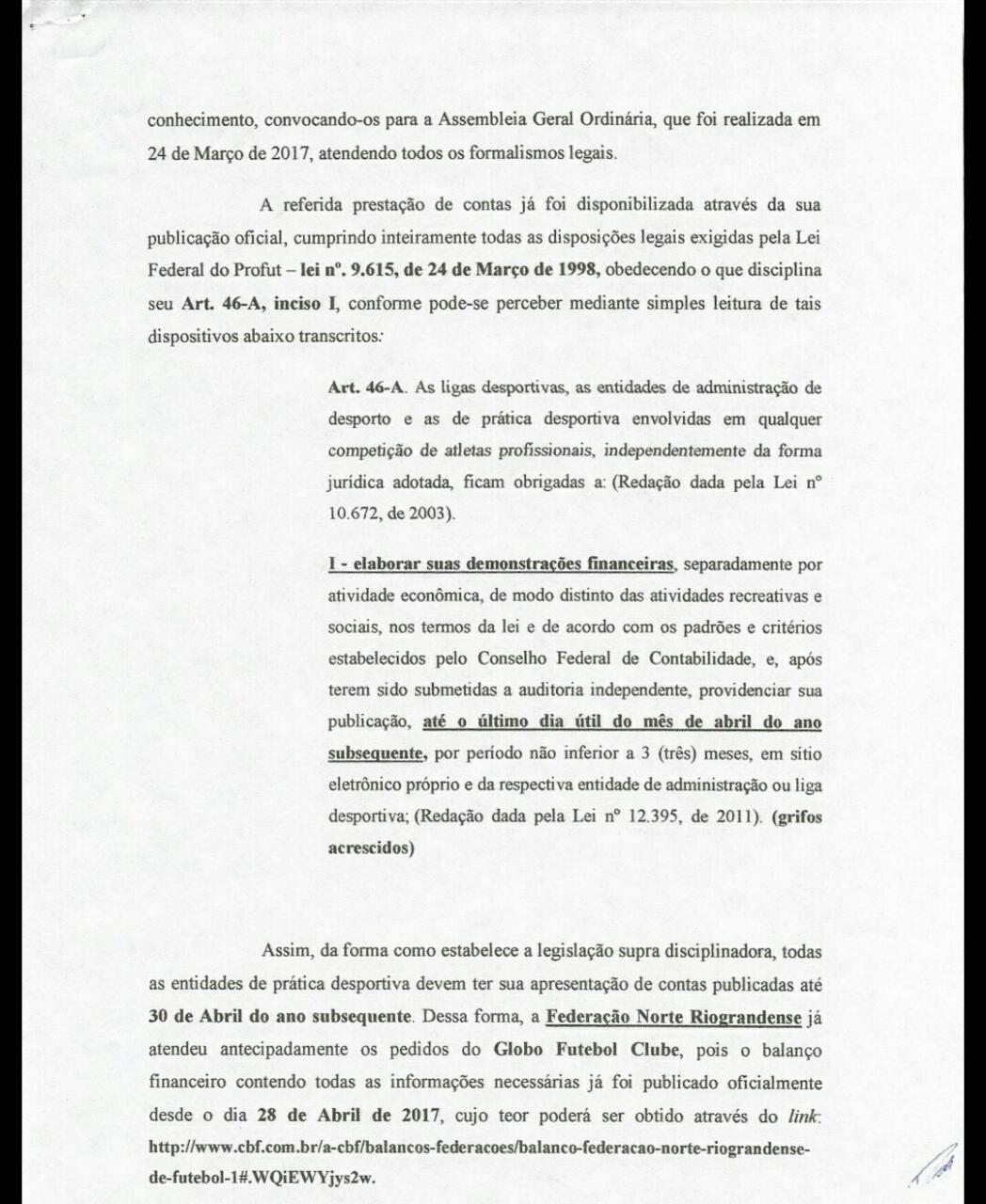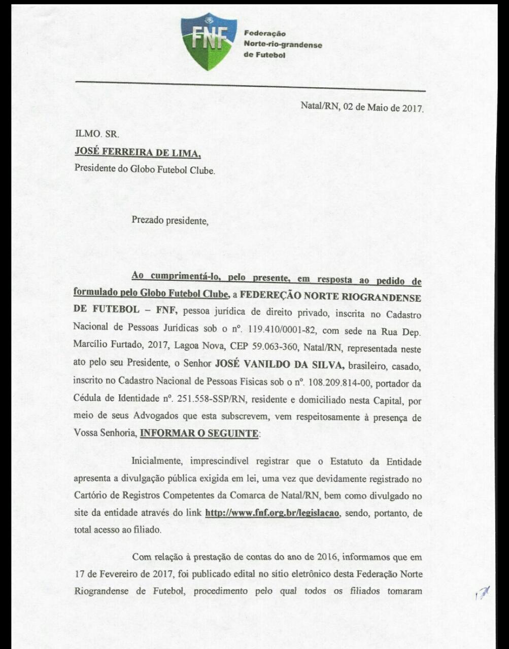 A Federação Norte-rio-grandense de Futebol (FNF), por meio de sua assessoria jurídica, atendeu a solicitação do filiado Globo Futebol Clube, em resposta referente a prestação de contas e ao estatuto da Federação.