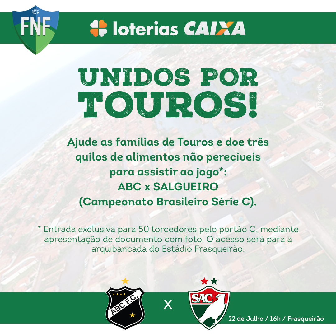 Em solidariedade aos moradores do município de Touros, localizado no litoral Norte do Rio Grande do Norte, que foi afetado pela forte enchente que alagou a cidade na última semana, a Federação Norte-rio-grandense de Futebol e as Loterias Caixa se unem ao ABC Futebol Clube para somar forças neste momento de esperança e reconstrução das vidas de milhares de famílias.