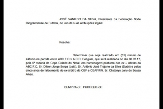 O presidente da Federação Norte-rio-grandense de Futebol expediu ato na tarde desta quarta-feira (08), que determinou um minuto de silêncio na partida entre ABC x Potiguar, pela 6ª rodada da Copa Cidade do Natal.