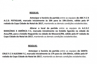 Por meio de resolução, a Federação Norte-rio-grandense de Futebol informou alteração em 3 partidas válidas pela 6ª rodada da Copa Cidade do Natal 2017.