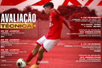 O América divulgou datas de novas avaliações técnicas de jogadores para compor as categorias de base. A equipe do Alvirrubro passará por idades do interior do RN e Paraíba.