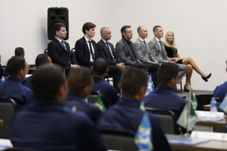 Eles receberam as insígnias das mãos de Hernan Maidana, Oficial de Desenvolvimento da FIFA para a América do Sul, e a camisa da Seleção Brasileira do Gerente-Geral de Arbitragem da CBF, Alício Pena Júnior. Antes da entrega das homenagens, os árbitros e assistentes assistiram a um vídeo com seus clipes atuando no Mundial.