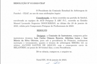 Em resolução emitida nesta segunda-feira (30), a CEAF-RN determina que o árbitro participe de instrução e treinamento em relação à regra 12 de arbitragem, relativa a decisões de campo sobre faltas e incorreções. A comissão formada pelos instrutores Luiz Carlos Câmara Bezerra, Aldeilma Luiza e Izac Márcio da Silva Oliveira será responsável pela instrução e deverá enviar relatório em 30 dias. Durante o período, portanto, o árbitro ficará afastado das partidas.