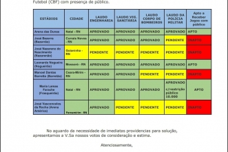 A Federação Norte-Rio-Grandense de Futebol emitiu notificação nesta segunda-feira (9) sobre os estádios que ainda tem pendência de laudos (CREA, Vigilância Sanitária, Corpo de Bombeiros e Polícia Militar) exigidos em Estatuto do Torcedor para receber público em eventos da FNF ou CBF. Na falta de um dos laudos, o evento deve acontecer de portões fechados.