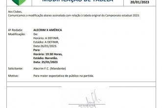 A partida entre Alecrim e América no dia 26/01, válida pela 4ª rodada do Campeonato Nota Potiguar, antes sem local e horário definidos, acontecerá no Estádio Barrettão às 19h30 a pedido do clube mandante.