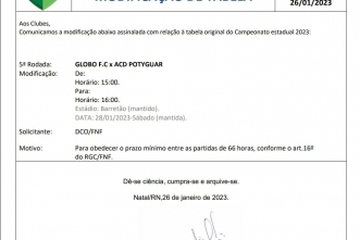 A Federação Norte-Rio-Grandense de Futebol informa a alteração de horário da partida entre Globo e Potyguar Seridoense válida pela 5ª rodada do Campeonato Potiguar. O jogo anteriormente marcado para 15h acontecerá às 16h, no mesmo local, o Estádio Barrettão em Ceará-Mirim. A modificação atende o prazo mínimo de 66 horas exigido entre as partidas de um time.