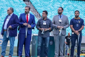 O presidente da FNF e vice-presidente da CBF, José Vanildo, e o presidente em exercício da FNF, Felipe Silva, participaram da entrega da taça da Copa do Nordeste Sub-20 ao Ceará na tarde dessa quarta-feira (17), na Arena Fonte Nova, em Salvador. A vitória do Vozão por 2 a 0 sobre o Bahia, pelo jogo de volta da final, garantiu ao Alvinegro o título do torneio regional pela primeira vez. A competição foi retomada nesta temporada e havia sido realizada pela última vez em 2021.