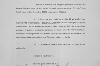 O Tribunal de Justiça Desportiva do RN emitiu portaria oficiando a Federação Norte-Rio-Grandense de Futebol pra que providencie o cumprimento do Regulamento do Campeonato Potiguar 2023, segundo o qual a associação que estiver inadimplente com as penalidades impostas pelo TJD-RN, fica impedida de participar de qualquer campeonato ou torneio promovido pela FNF. A Federação deve providenciar o cumprimento das penalidades aplicadas aos clubes pelo TJD e que estejam em aberto.